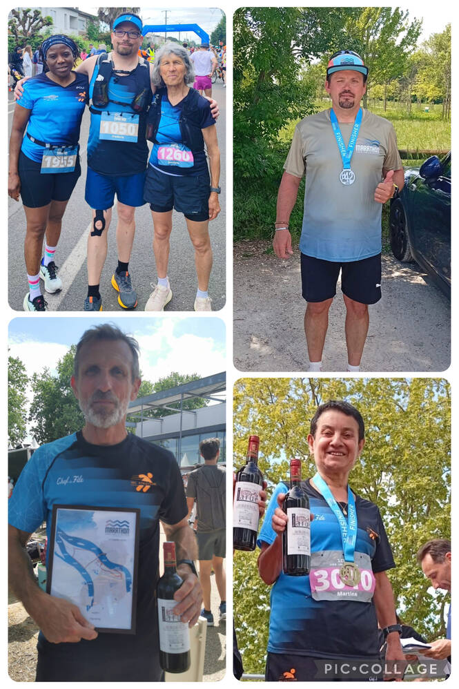 Ce samedi une grosse délégation du club s'est déplacée chez nos voisins de Jarnac pour participer aux différentes compétitions proposées par l'équipe du marathon du cognac. Michel, Fred B, Laurent étaient sur le marathon, Fred M, Laurence, Fred P, sur le semi-marathon, Patrick et Houcine sur le 10.5 KM. Sur l'épreuve reine Laurent notre président termine en 4h01, Fred B en 4h26 et Michel en 5 h 47 bravo pour ces bons résultats place maintenant à la récup. Sur le semi après trois ans sans compétition officielle Laurence réalise une très belle performance en finissant première de sa catégorie en 1'48, Fred M pour son tout premier semi avait pour objectif 2h30, résultat il termine en 2h29 bien joué le travail paye, Fred P réalise également un joli chrono en 1h47. Enfin sur la petite distance Houcine de retour de blessure obtient une très belle 9-ème place au général en 38"40 et une première place en catégorie junior, Patrick réalise également un joli chrono de 56"52. Un grand merci à nos supporters et supportrices du jour Armelle, Pascale, Alain et Loïc.